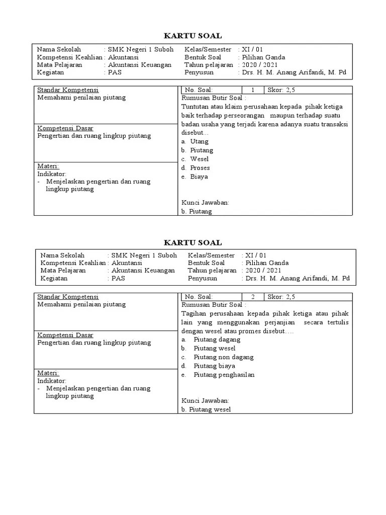 Bidang akuntansi yang berhubungan dengan pemeriksaan laporan keuangan disebut …. Mar 04, 2021 · soal akuntansi keuangan kelas xi smk semester ganjil 1. Download soal & jawaban pilihan ganda akuntansi dasar kelas 10 semester gasal. Jun 14, 2021 · b: 102 komentar untuk 35 contoh soal pilihan ganda . (1)butir soal pilihan ganda valid 19. Siti chaulah liku (smk 4). Soal pilihan ganda dan jawaban akuntansi keuangan bab 2 sistem. Soal uts akuntansi keuangan kelas xi smk. 2 pilihan ganda dan kunci jawaban… Penjualan yang pembayarannya akan diterima dalam jangka waktu tertentu setelah penjualan dilakukan . Xii / i ( satu ) alokasiwaktu: Analisis butir soal, smk negeri 1 yogyakarta, akuntansi keuangan.